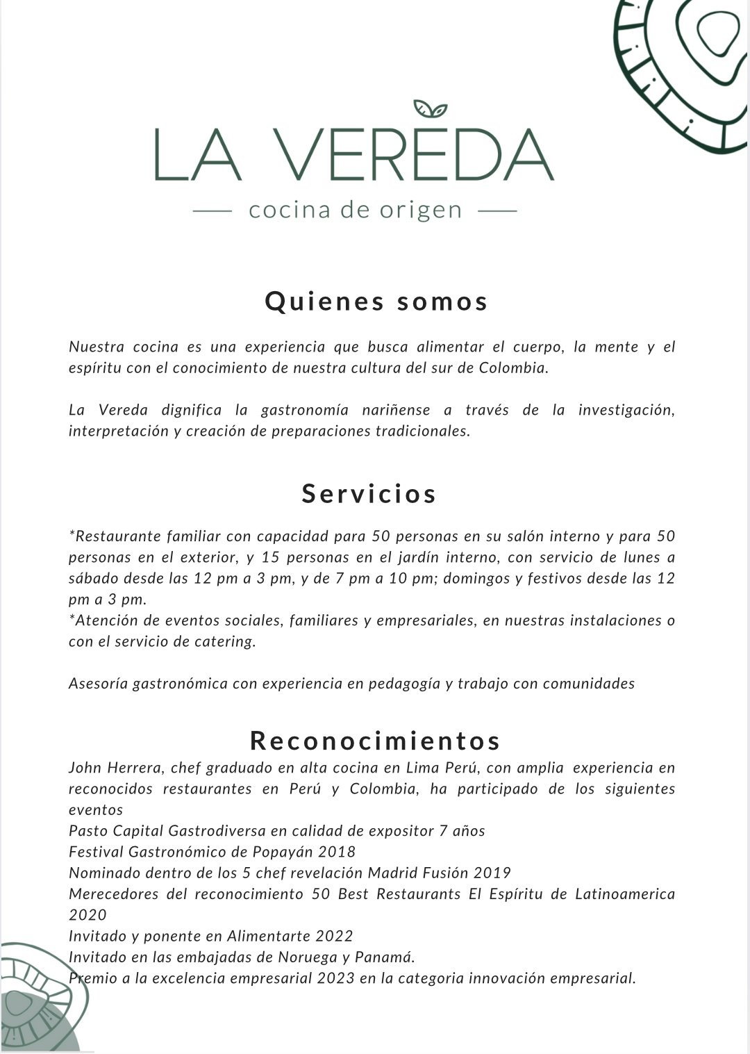 LA VEREDA COCINA DE ORIGEN, fundada en 2016 en Nariño, es un restaurante que celebra y reinventa la gastronomía tradicional nariñense. Su propuesta combina innovación, rescate cultural, sostenibilidad y conexión con pequeños productores